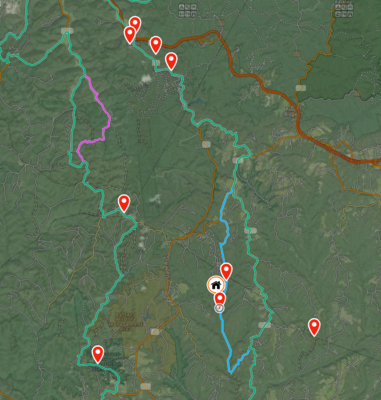 So i've loaded the trail into GaiaGPS and I'm working on making a route that we can divide up by days. Our cabin is near the top of the KAT loop right next to HARD 1 and HARD 11 that were shown at the beginning of this thread. Hard 1 is the light blue trail and Hard 11 is the pink trail. You can see the House symbol, thats where our Cabin is located. These are both fairly close to the house, the other Hard sections are a bit more of a drive. I'll dig more into that soon.